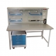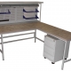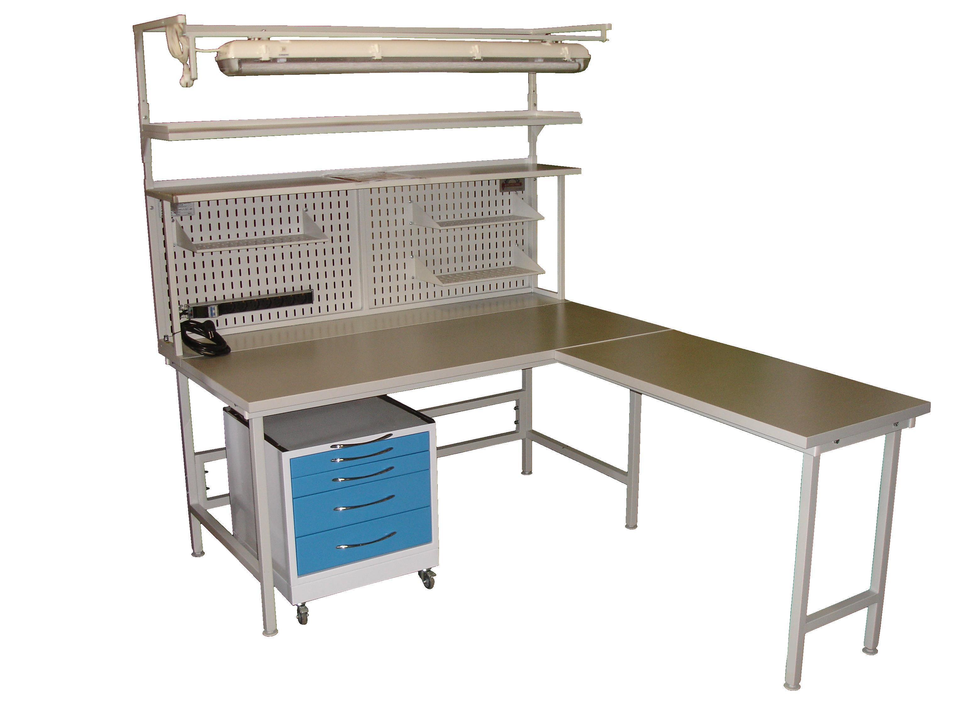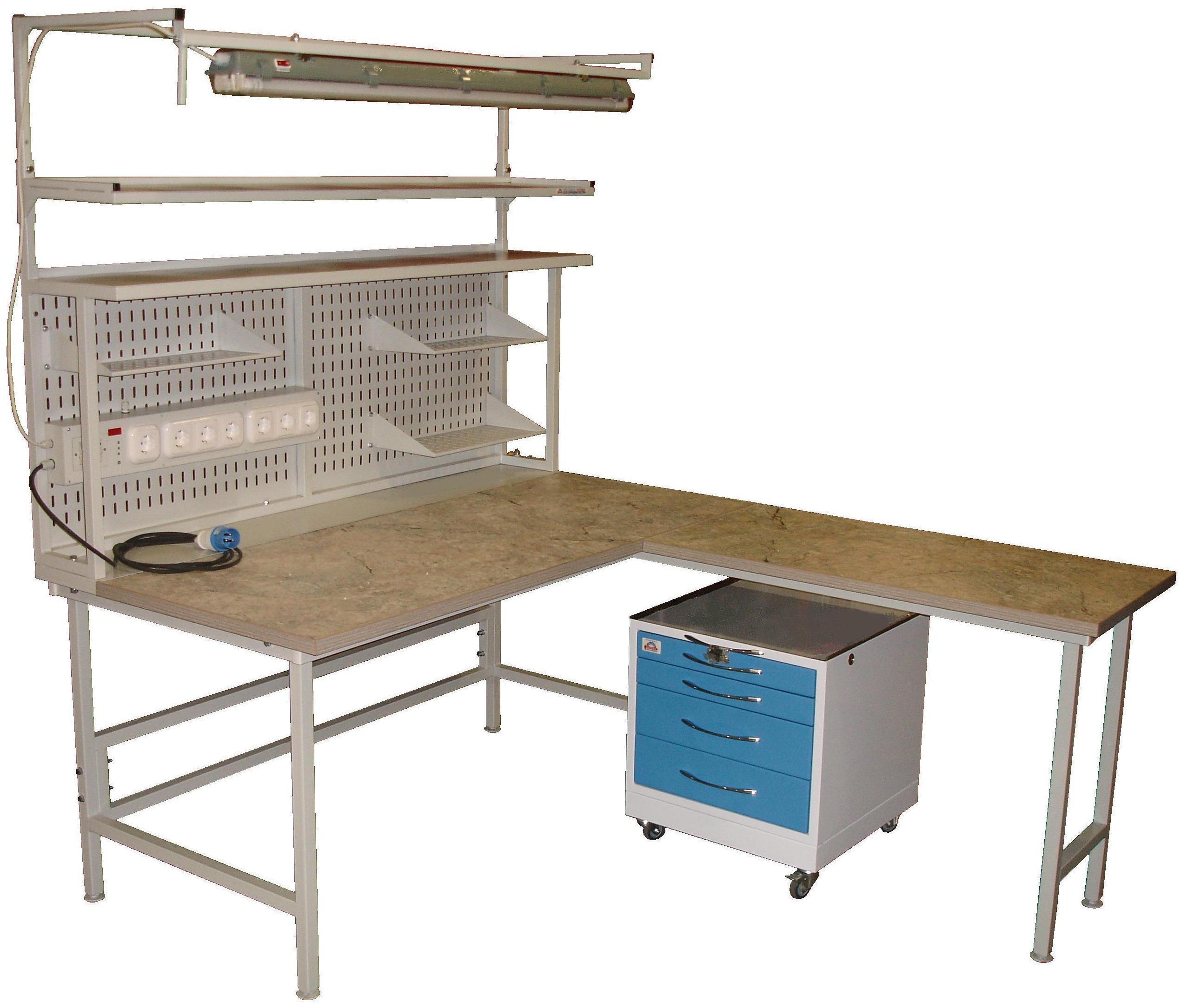 Базовая модель представляет собой металлический каркас из профильной трубы 30х30х1,5 на регулируемых опорах для компенсации неровностей пола, подкатной тумбой с четырмя выдвижными ящиками на телескопических направляющих, блоком из семи розеток на 220 В и светодиодным светильником. Порошковая окраска.