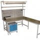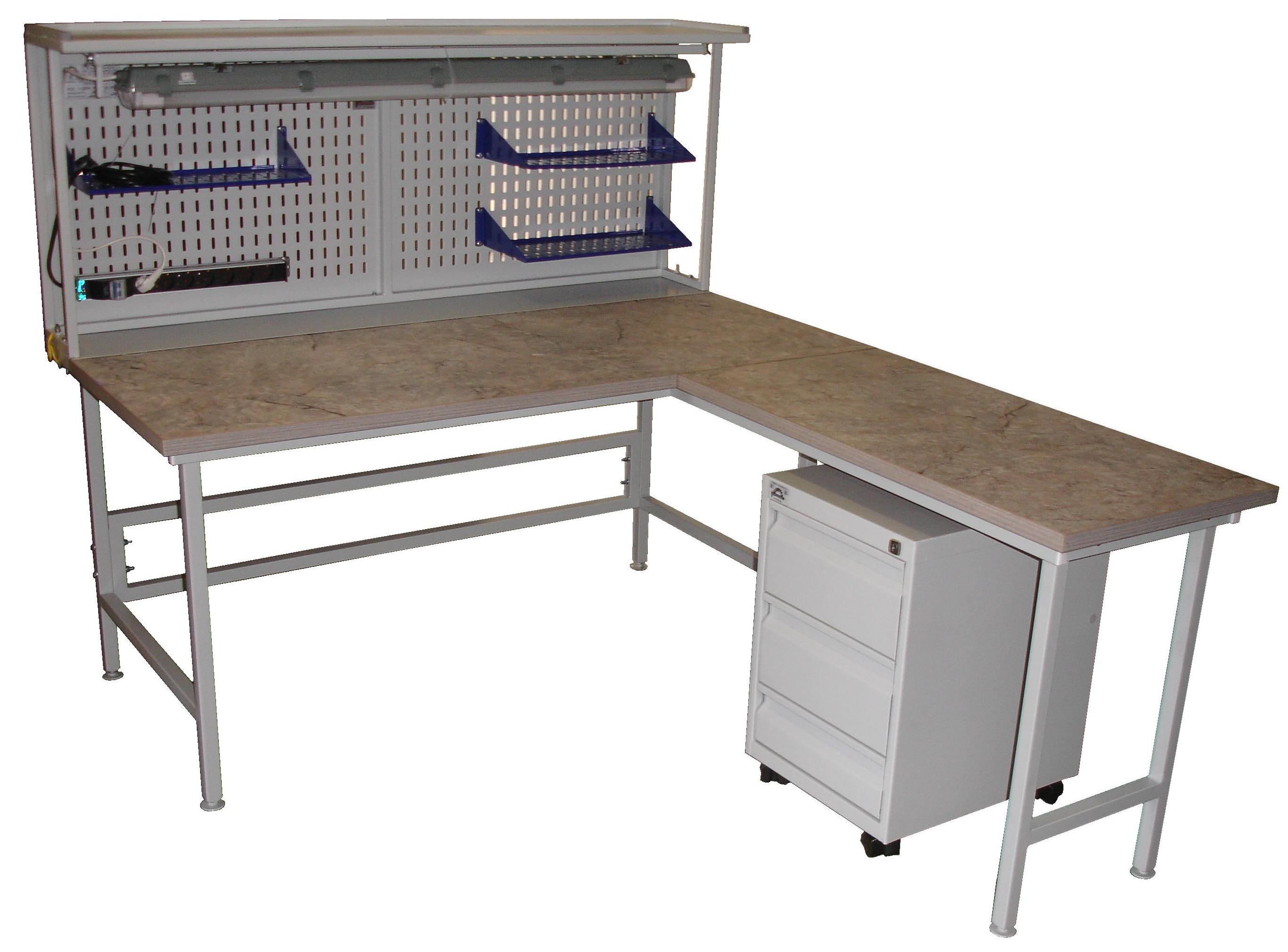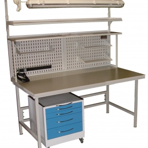 Базовая модель представляет собой металлический каркас из профильной трубы 30х30х1,5 на регулируемых опорах для компенсации неровностей пола, подкатной тумбой с четырмя выдвижными ящиками на телескопических направляющих, блоком из семи розеток на 220 В и светодиодным светильником. Порошковая окраска.